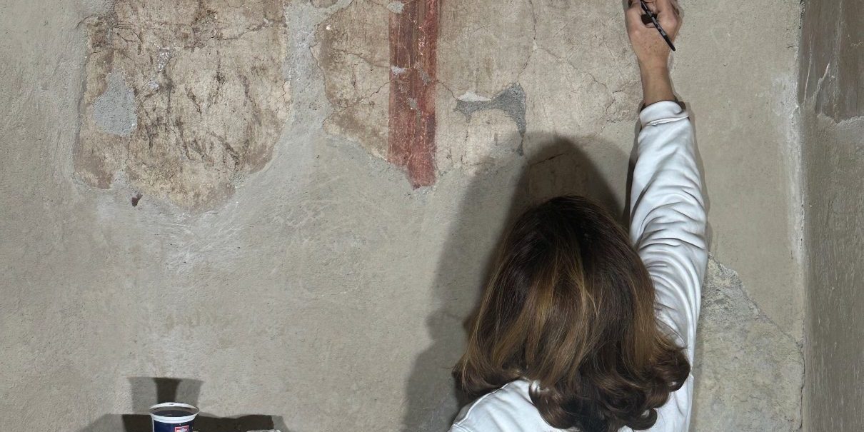 Il riposizionamento di un frammento di intonaco originale, crollato nel 2019 e accuratamente conservato nei depositi del Parco, dimostra l’importanza di una gestione attenta e continuativa.