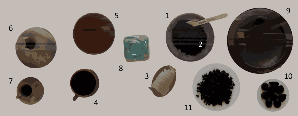 Among the more refined items stands out a blown glass bottle (8), likely used to hold fine liquids. Together with a bronze patera (9), it suggests that even breakfast could be accompanied by gestures of elegance. The patera, with its incised lines and decorated base, was not necessarily used for ritual purposes; recent studies increasingly interpret it as a domestic item, possibly for hand washing or to welcome guests with a gesture of care and hospitality.