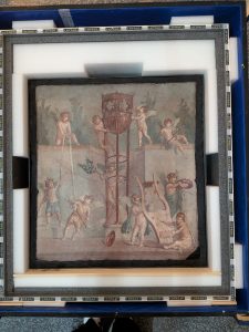 - il Dipinto con cornice in legno carbonizzato raffigurante amorini alati, scena ispirata al culto di Apollo che apporta al percorso della mostra un tocco di poesia figurativa e di colta eleganza dell’antica Ercolano. L’opera è stato oggetto di un accurato restauro finanziato dal Museo Lugdunum di Lione.
